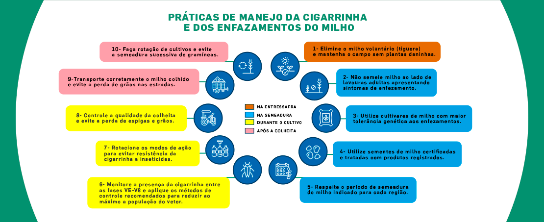 Para redução e prevenção da ocorrência de cigarrinha-do-milho e os danos relacionados ao complexo de enfezamento, podemos nos basear nos 10 passos apresentados no site do MAPA.
