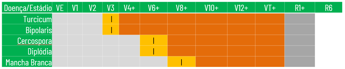 Em condições favoráveis de clima, o hospedeiro e a presença do patógeno de cada doença foliar têm um momento fenológico preferencial de infecção (I) e consequentemente um período de dano na cultura (vermelho), conforme quadro abaixo.